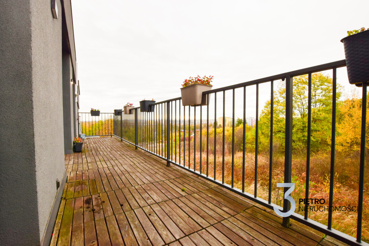 Jednym z największych atutów apartamentu jest prywatny taras na dachu o powierzchni 91 m², na który prowadzą wewnętrzne schody oraz duże przesuwne okno (2,5 m długości) otwierane elektrycznie, marki Lamilux.