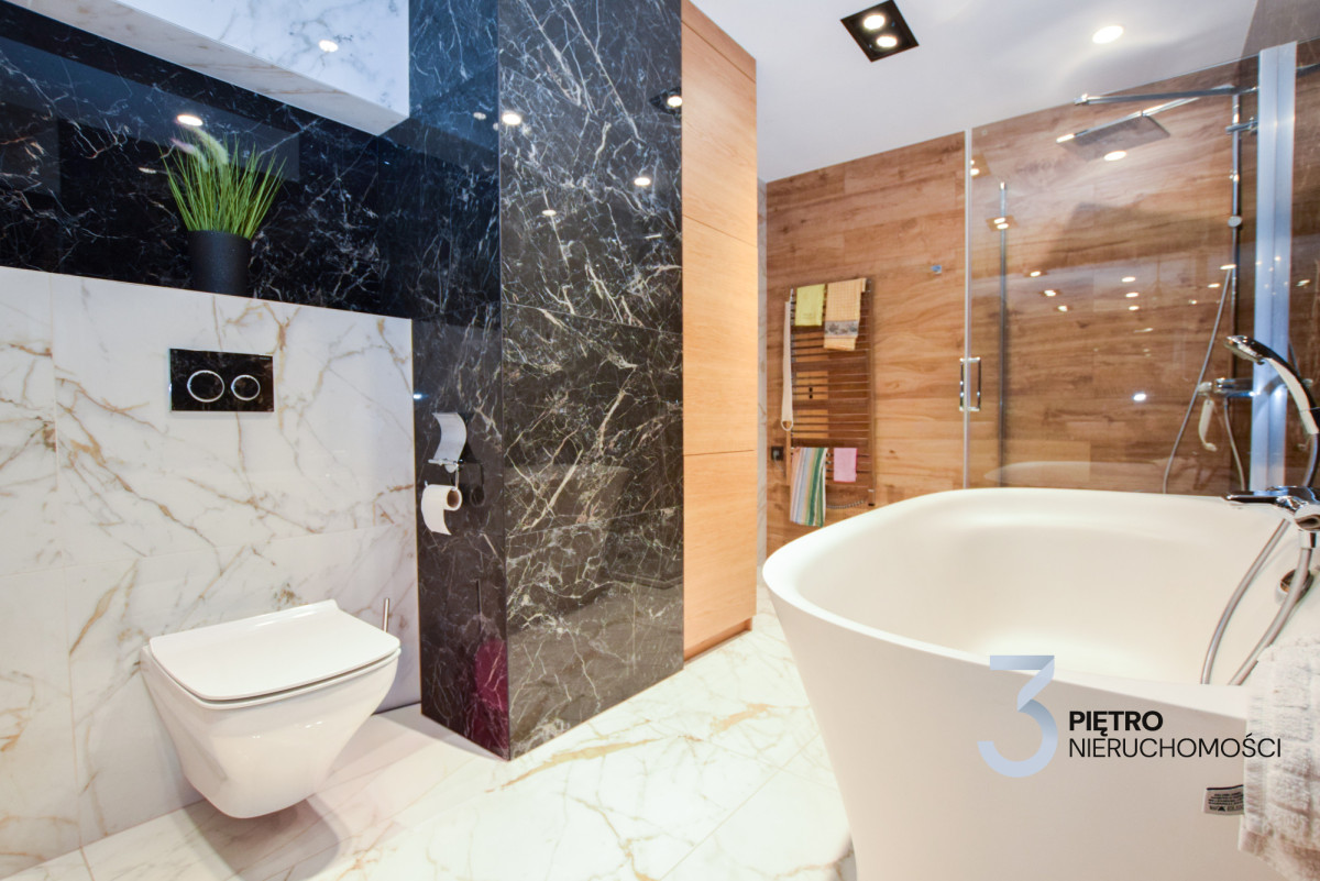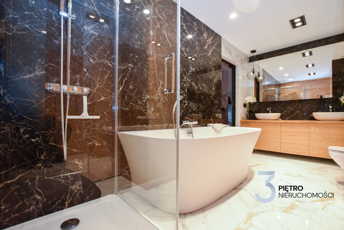 Stylowa łazienka wykończona została włoskimi płytkami o wzorze marmuru w dużym formacie. Znajdują się tu dwie umywalki, wolnostojąca wanna Duravit CapeCode (190 × 90 cm), prysznic oraz WC.