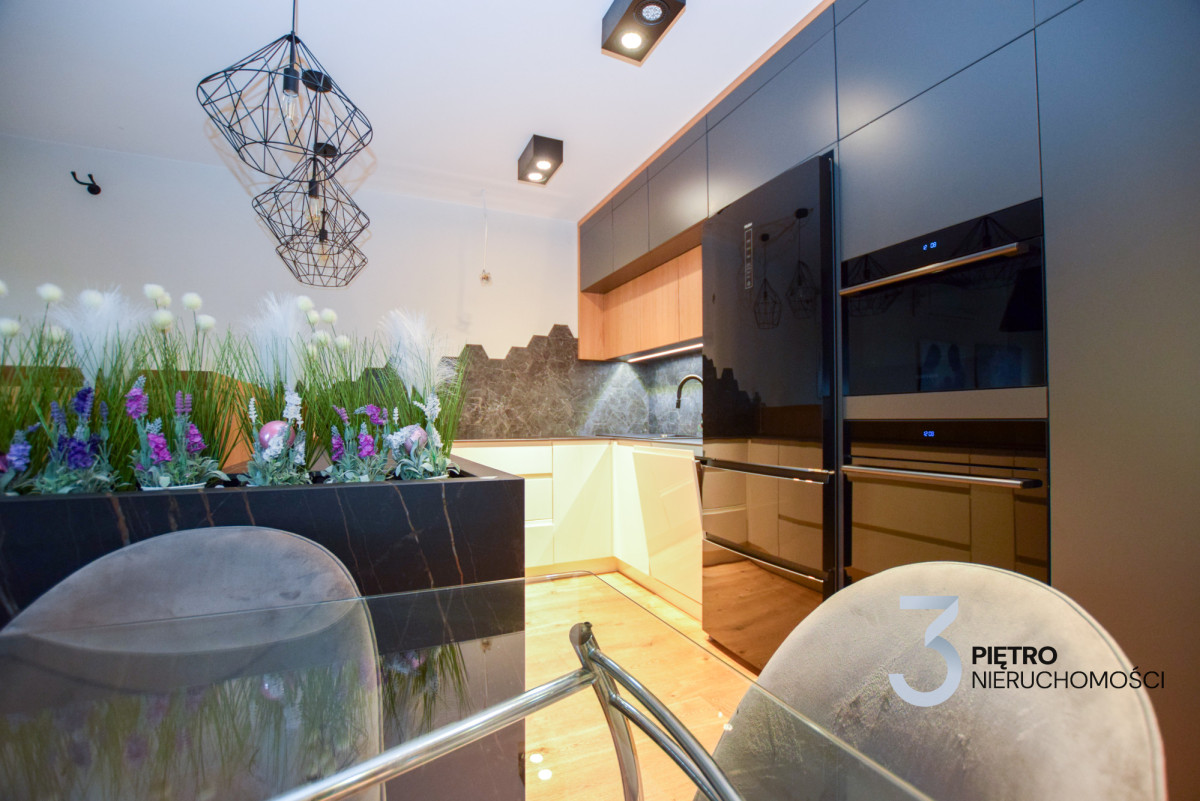 Funkcjonalna kuchnia, zaprojektowana w układzie litery C, została oddzielona od salonu półwyspem, co zapewnia dużą przestrzeń roboczą i komfort użytkowania. Zastosowano blat ze spieku kwarcowego firmy Laminam w kolorze Noir Desir mat, wyróżniający się wyjątkową trwałością i elegancją. Kuchnia jest w pełni wyposażona w wysokiej klasy sprzęt AGD: dwa piekarniki, zmywarkę, lodówkę oraz płytę indukcyjną.