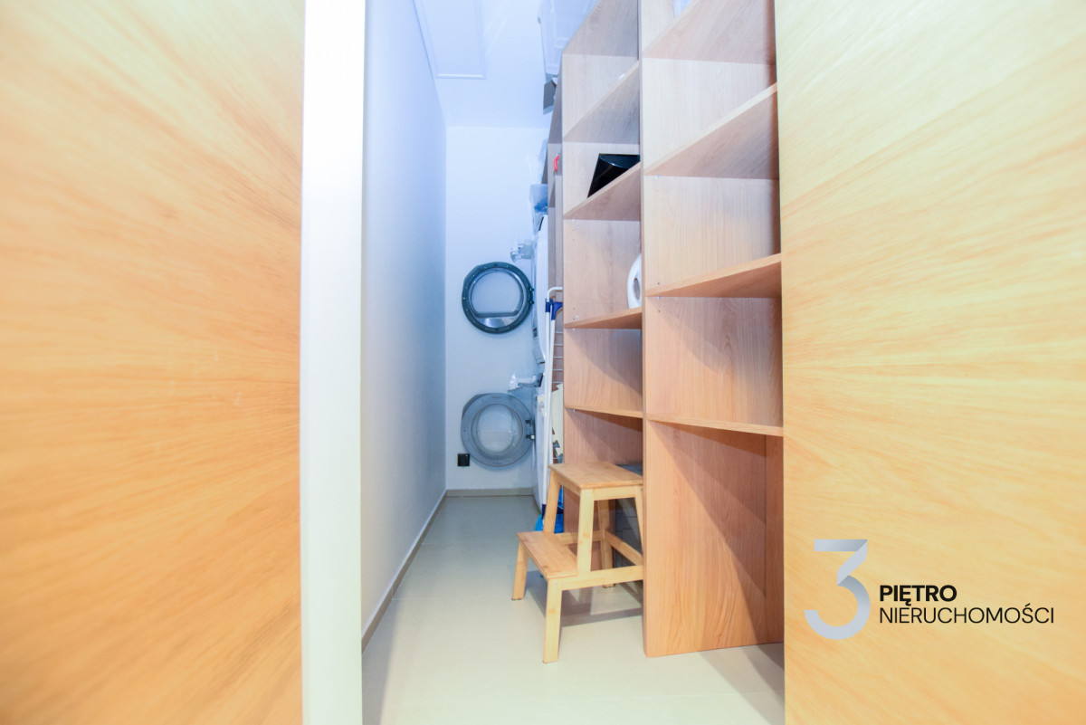 Łazienka posiada bezpośrednie przejście do pomieszczenia gospodarczego, wyposażonego w zabudowę wykonaną na wymiar, pralkę oraz suszarkę. Pomieszczenie oddzielono składanymi drzwiami, co zapewnia funkcjonalność i estetykę.