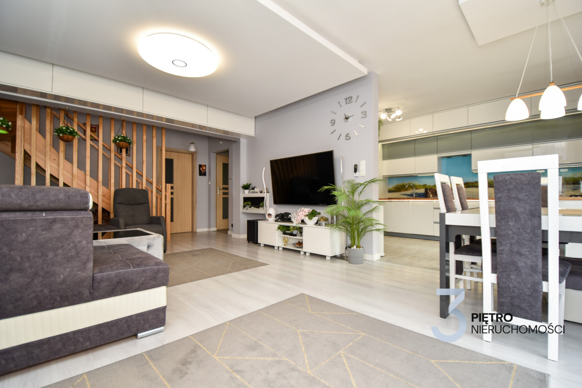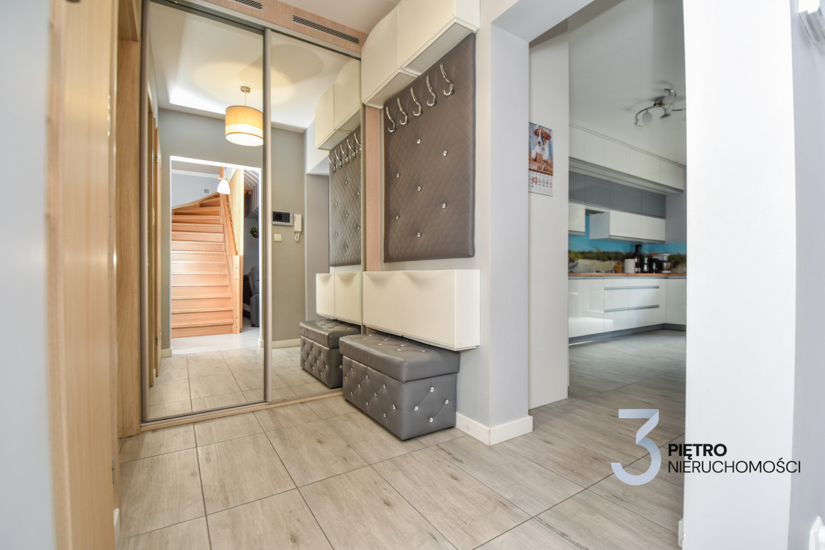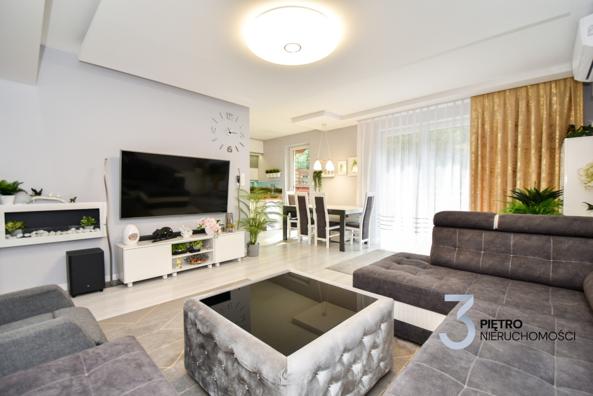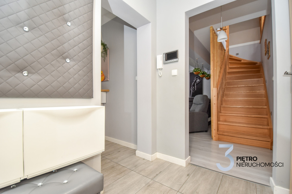 Na sprzedaż wyjątkowe mieszkanie w zabudowie szeregowej o łącznej powierzchni 120 m², wykończone w najwyższym standardzie i gotowe do wprowadzenia. Mieszkanie jest środkowe, na parterze znajduje się 78 m² przestrzeni dziennej, a dodatkowe 42 m² poddasza daje wiele możliwości aranżacyjnych. Mieszkanie zostało urządzone z wykorzystaniem materiałów premium, jest klimatyzowane, częściowo wyposażone w ogrzewanie podłogowe, a dodatkowo posiada nowoczesne ogrzewanie gazowe z pieca dwufunkcyjnego. Zainstalowany światłowód zapewnia szybki internet, a całość sprzedawana jest wraz z pełnym wyposażeniem i umeblowaniem.