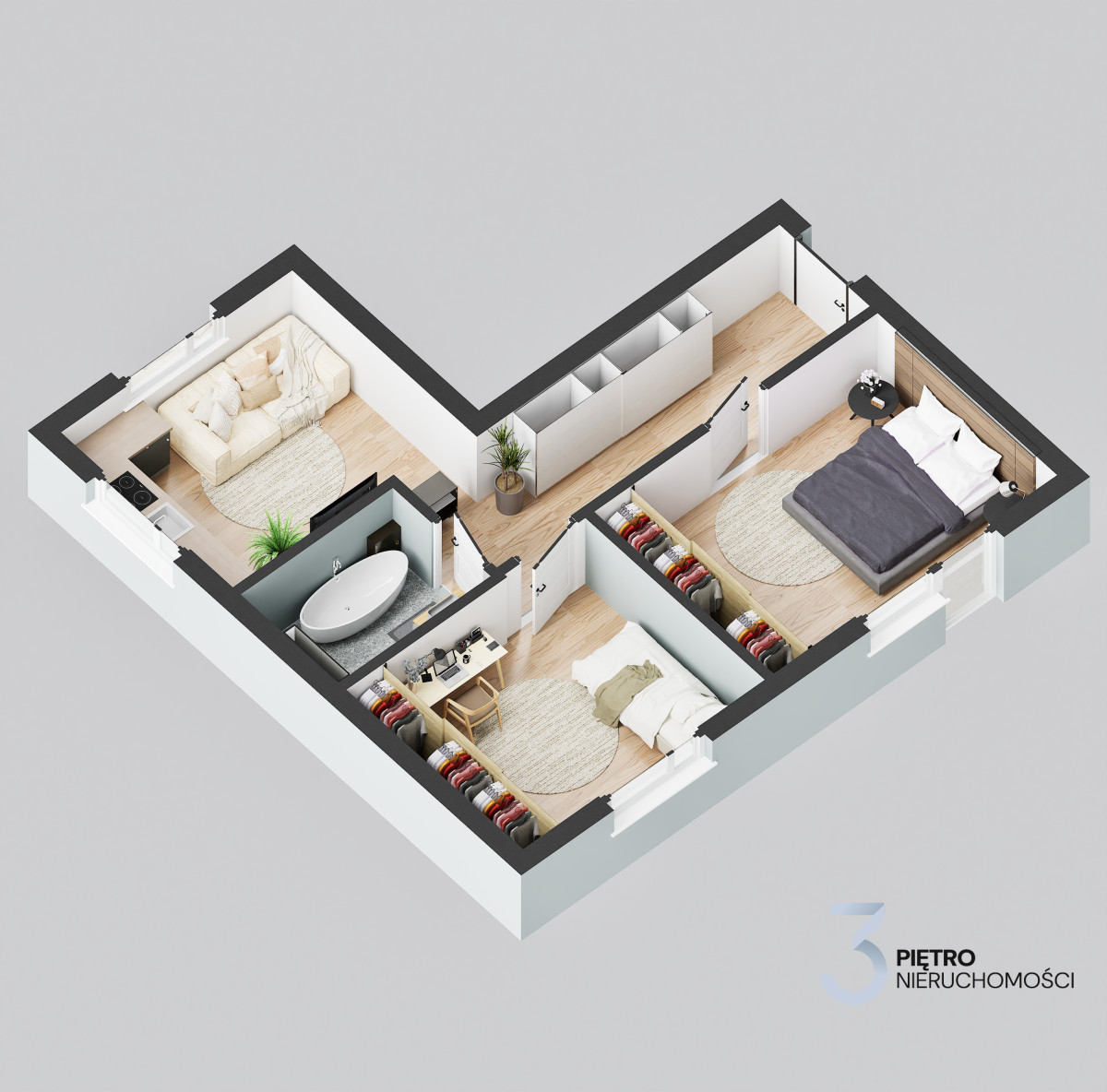 UKŁAD POMIESZCZEŃ Łączna powierzchnia mieszkania 51 m2 + piwnica 4,37 m2 • Sypialnia z balkonem francuskim • Salon z balkonem francuskim • Oddzielna kuchnia • Łazienka z WC • Przedpokój