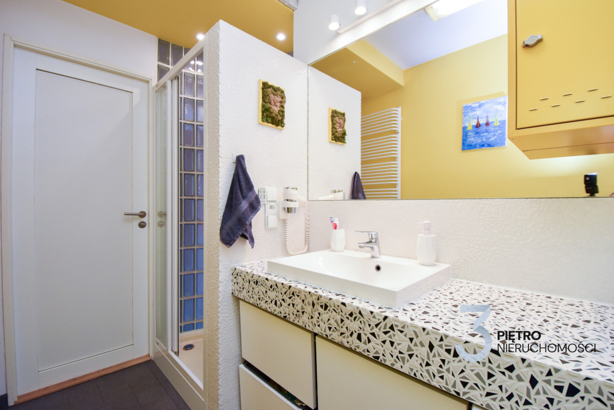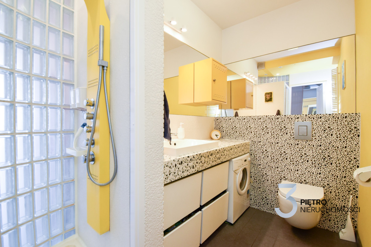• Łazienka z naturalnym światłem, pralką, kabina prysznicowa