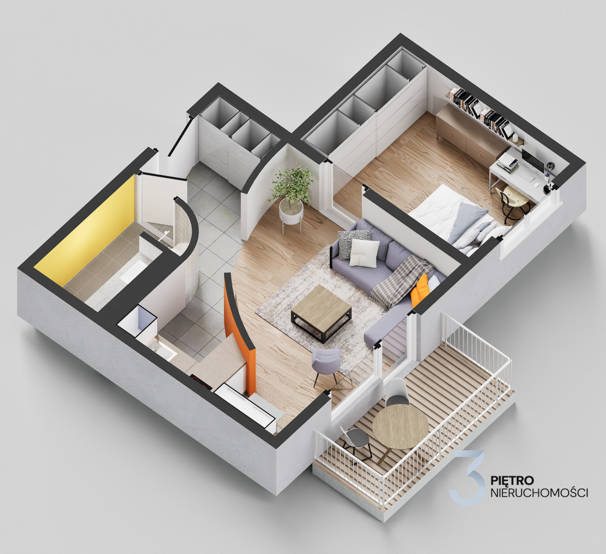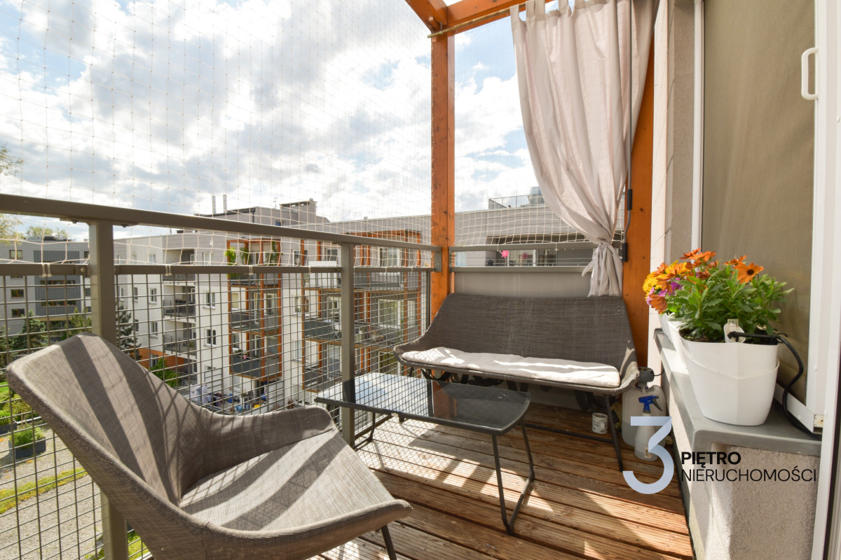 Balkon z drewnianą podłogą, oświetlenie, zasłonami bocznymi, gniazdami i suszarkami. Dodatkowo siatka przeciw ptakom. Mieszkanie zadbane i gotowe do zamieszkania. Wyposażenie do uzgodnienie.
