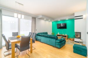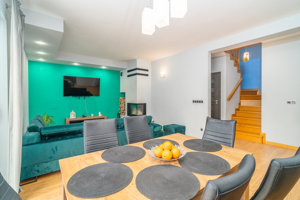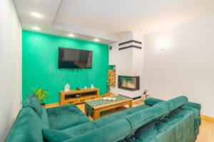 • Salon z kominkiem i wyjściem na taras