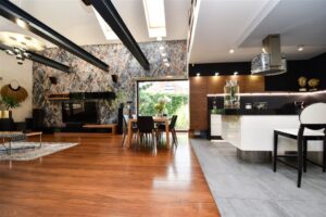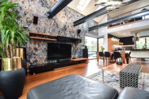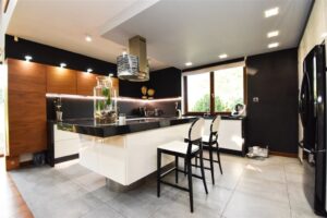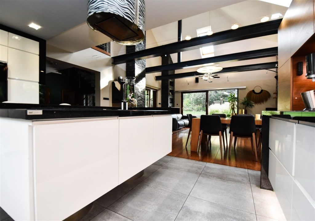 Na wyposażeniu domu znajduje się zabudowa meblowa wykonana na wymiar z wysokiej jakości materiałów.