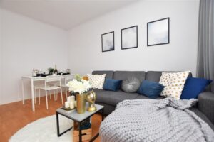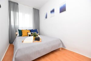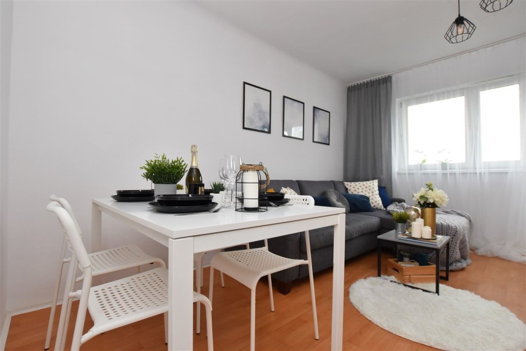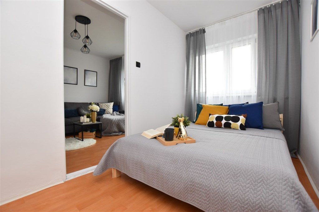 Dwupokojowe mieszkanie położone na szóstym piętrze w wysokim bloku z windą. Czysta, zadbana klatka schodowa, budynek po termomodernizacji. Mieszkanie gotowe do zamieszkania. Kuchnia wyposażona w sprzęty AGD (lodówka, kuchenka gazowa z piekarnikiem), w sypialni znajduje się duże łóżko oraz szafa, w salonie narożnik z funkcją spania.