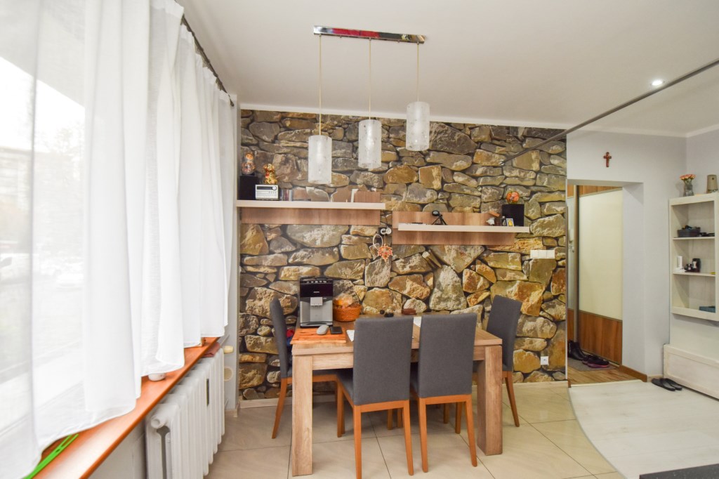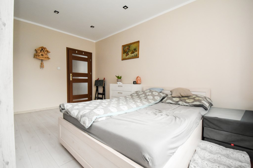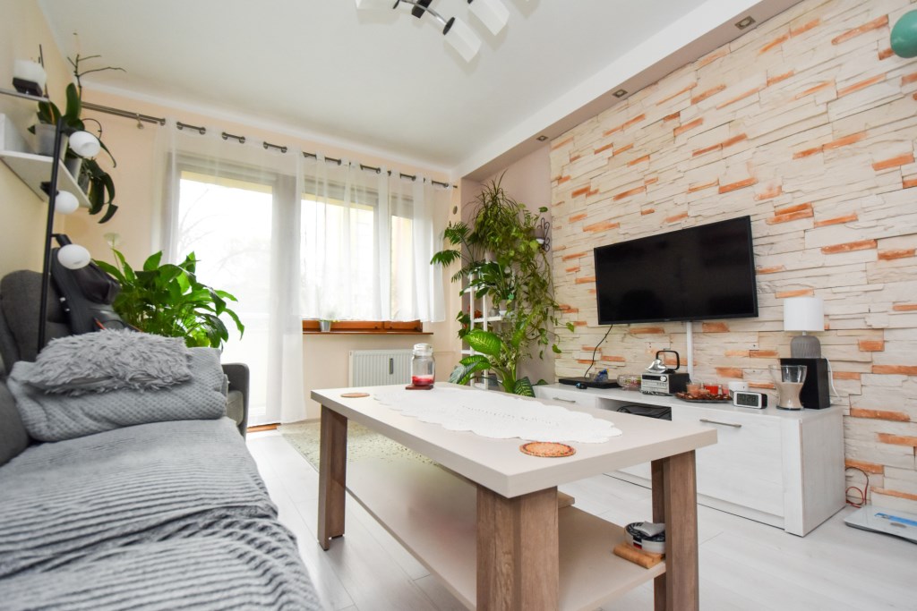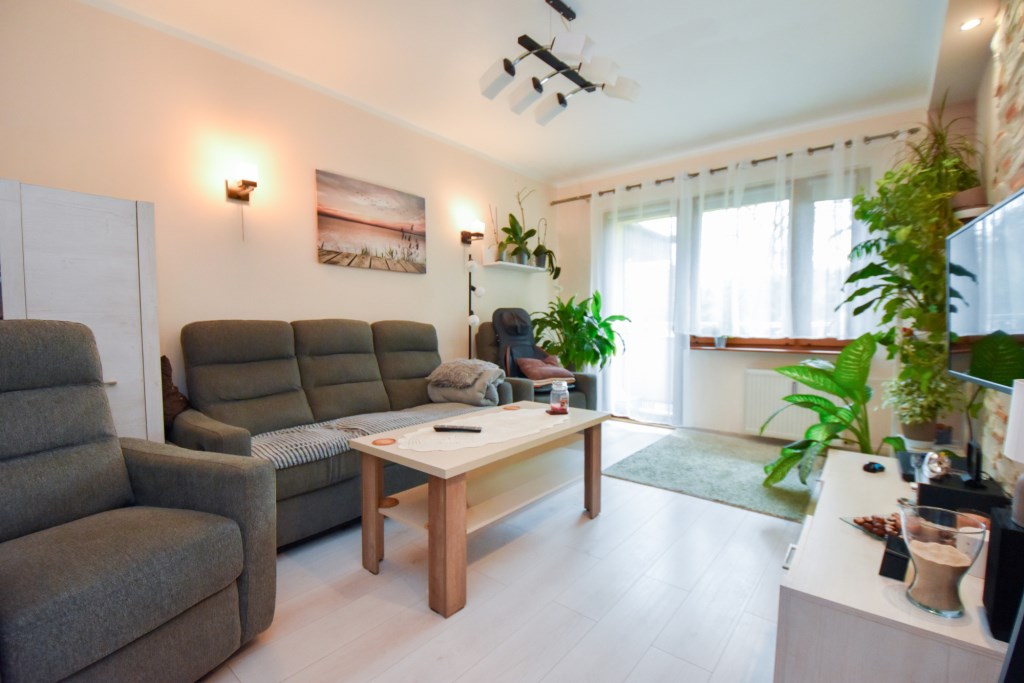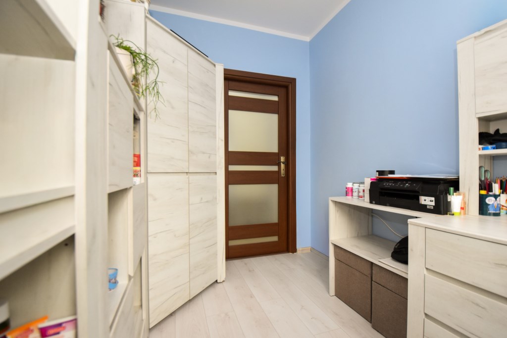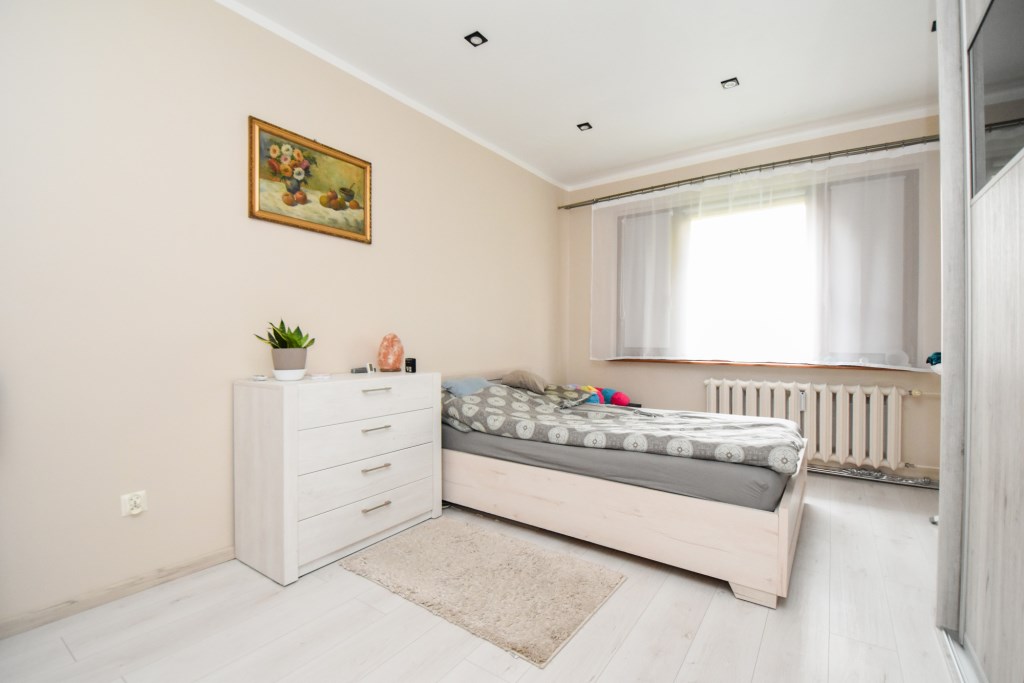 Mieszkanie znajduje się na parterze 10-piętrowego bloku. Mieszkanie jest w bardzo dobrym stanie technicznym. Zamontowano wysokiej jakości okna firmy Drutex, dźwiękoszczelne, z ekspozycją na północ i południe. Z balkonu rozpościera się przyjemny widok na zieleń. Budynek przeszedł termomodernizację, a części wspólne są czyste i zadbane. W lokalu wymieniono instalację hydrauliczną oraz piony kanalizacyjne, a instalacja elektryczna jest nowa, trójfazowa, co umożliwia podłączenie płyty indukcyjnej. W zeszłym roku odświeżono ściany i wymieniono panele podłogowe. Kuchnia posiada zabudowę z dużą ilością szafek, a w ubiegłym roku wykonano także pojemne szafy w sypialni i przedpokoju. Dodatkowo przy wejściu znajduje się trzecia zabudowana szafa, zapewniająca jeszcze więcej miejsca do przechowywania. Do lokalu przynależy piwnica oraz dodatkowe pomieszczenie z osobnym wejściem (4 m²) z boku budynku.