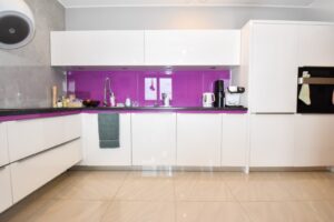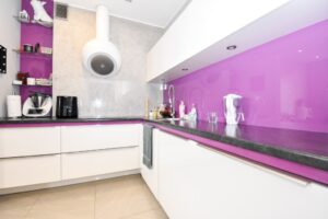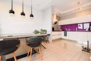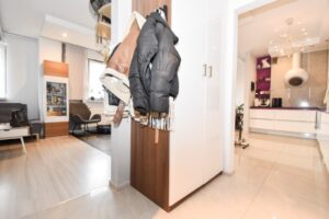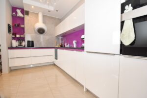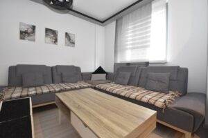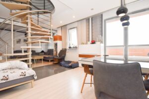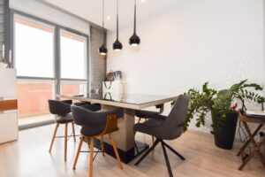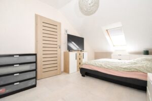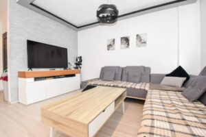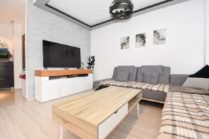 • Salon z wyjściem na balkon połączony z aneksem kuchennym