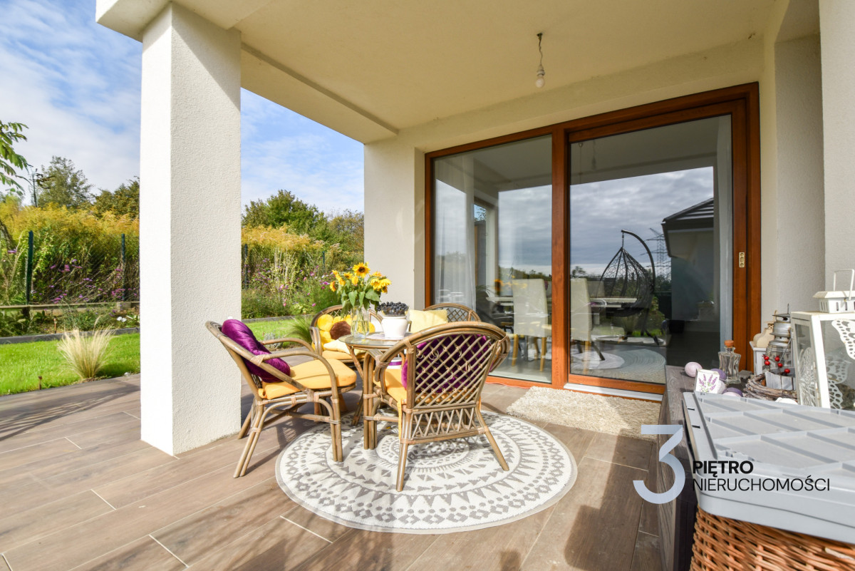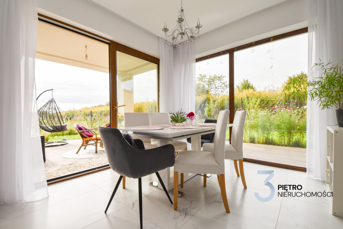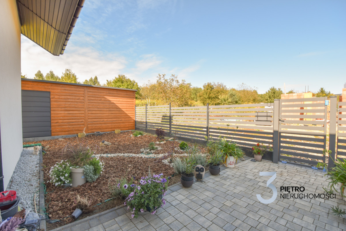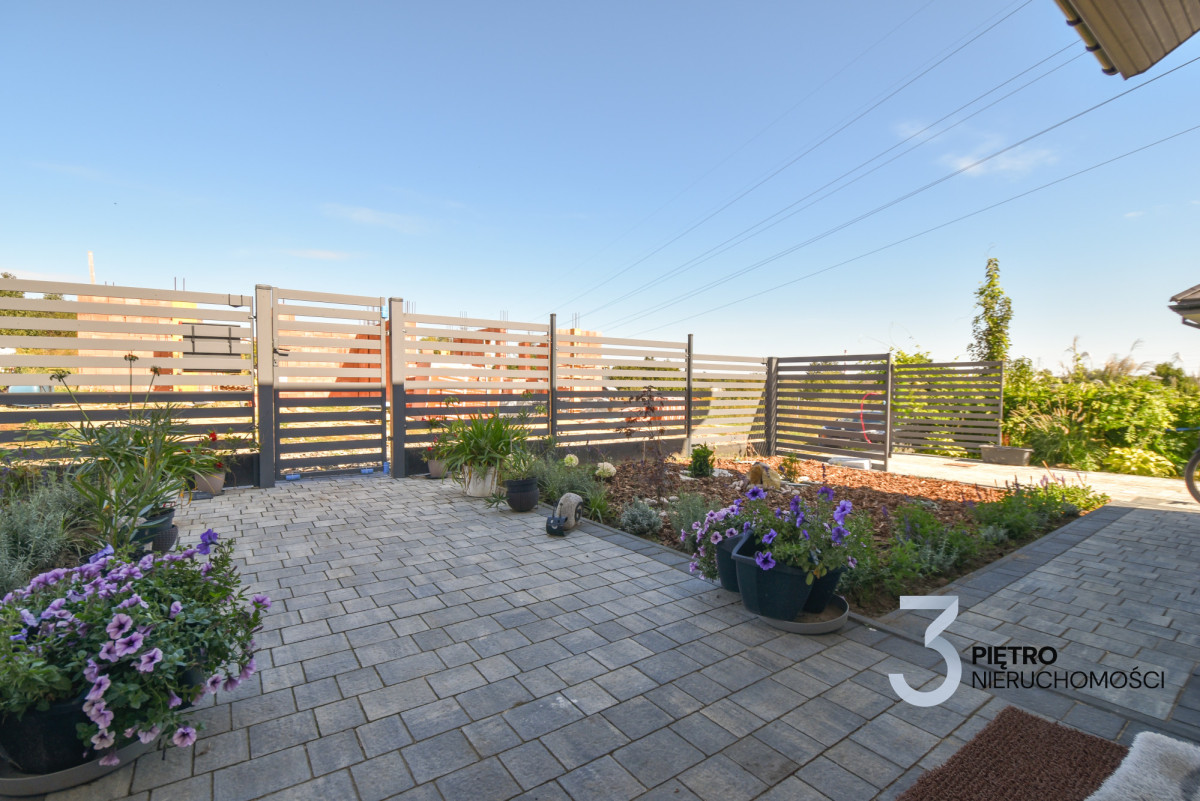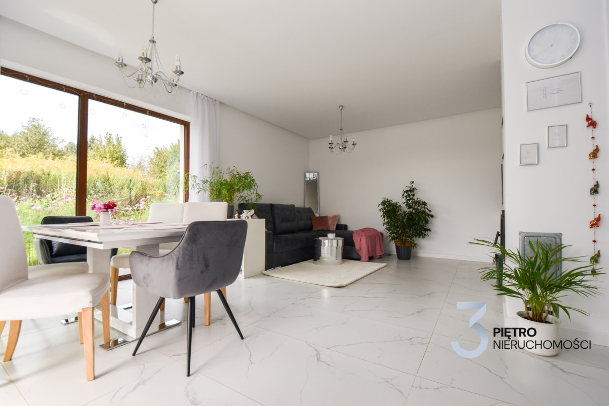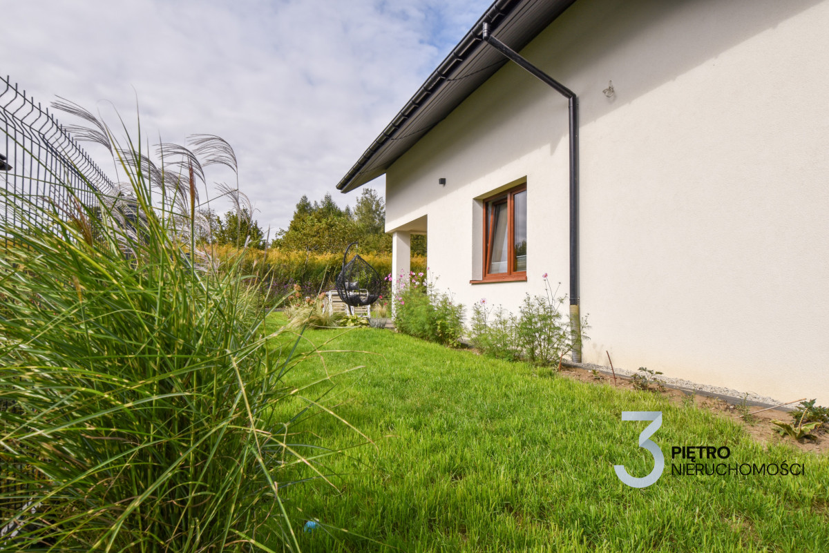 Budynek ocieplony został styropianem o grubości 20 cm, dach pokryty blachodachówką, a trzyszybowe okna zapewniają komfort i energooszczędność - w salonie zastosowano nowoczesny system przesuwny z wyjściem na taras. Działka o powierzchni 450 m² jest w pełni ogrodzona i zagospodarowana, z podjazdem wyłożonym kostką brukową oraz możliwością wykonania dodatkowego zadaszenia.